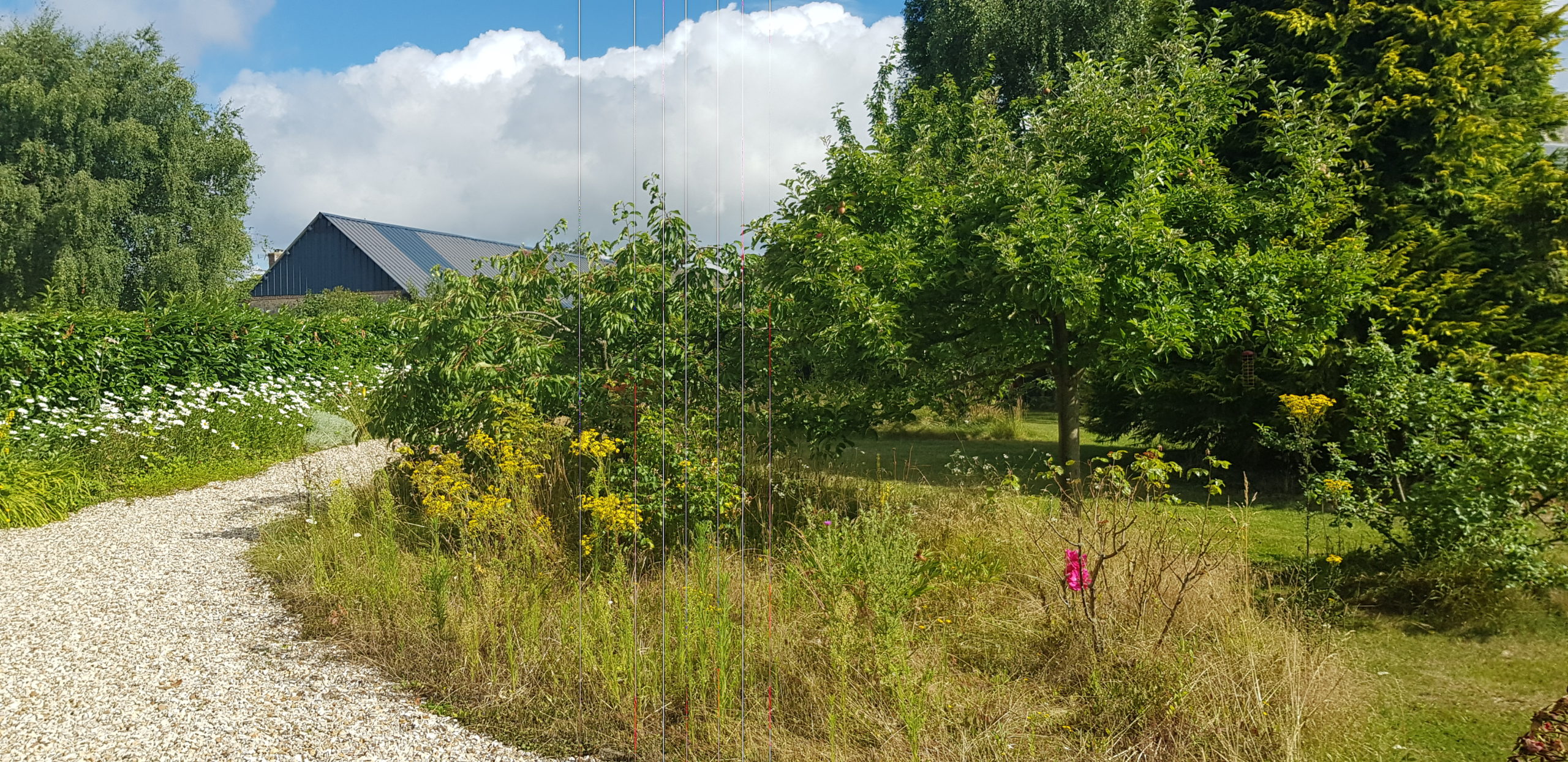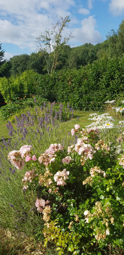 Nous cultivons notre jardin de manière naturelle : espacement de la tonte et tonte seulement des allées, respect de la petite faune. Le jardin comprend un verger, un potager, et des plantes d’ornement ou aromatiques (beaucoup de sauge, lavande et autres plantes mellifères).