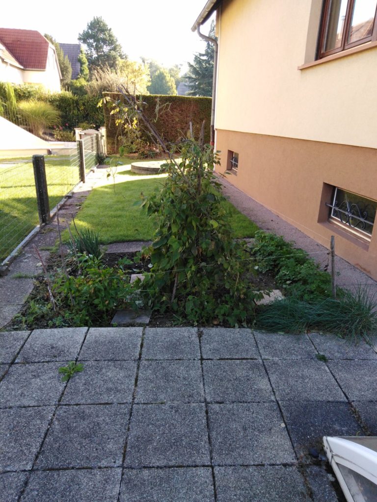 Arbres présents : cerisier, mirabellier, poirier, noisetier ainsi qu’un sapin et des haies (ifs). Des outils d’un certain âge sont à disposition : bêche, binette, 300 m de tuyaux goutte à goutte avec possibilité d’arroser en surface. L’eau vient d’un puits de 3 m de profondeur.