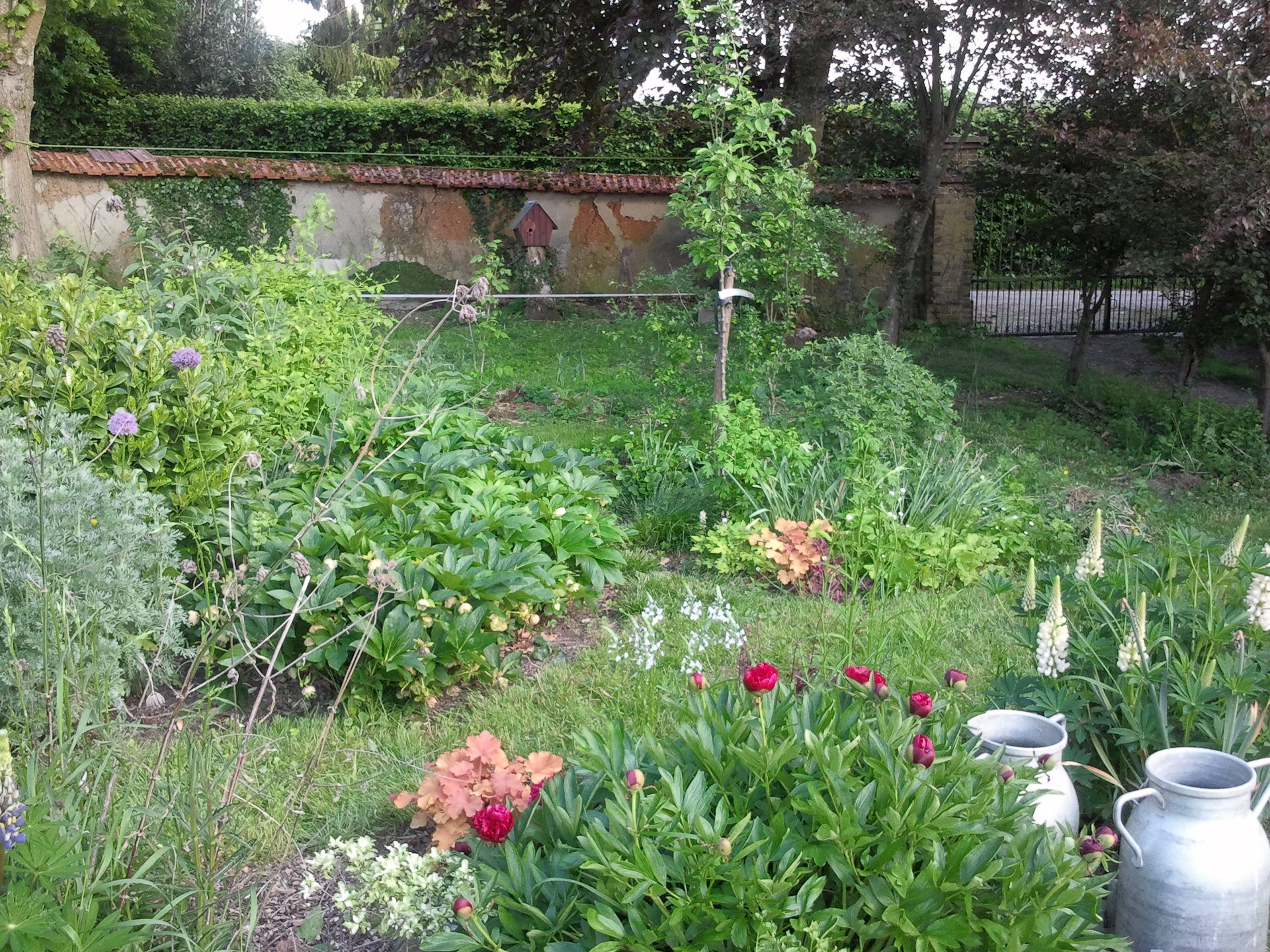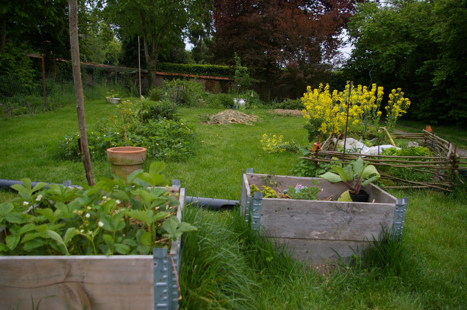 Il y a des cultures sur paille, des carrés potagers et quelques buttes en permaculture ainsi qu’un vieux carré surélevé en plessis de noisetiers à refaire… Je dispose d’un compost démarré il y a 7 ans, d’une citerne de 3 000 litres environ et de quelques outils de jardin. Nous avons aussi une ruche à proximité.