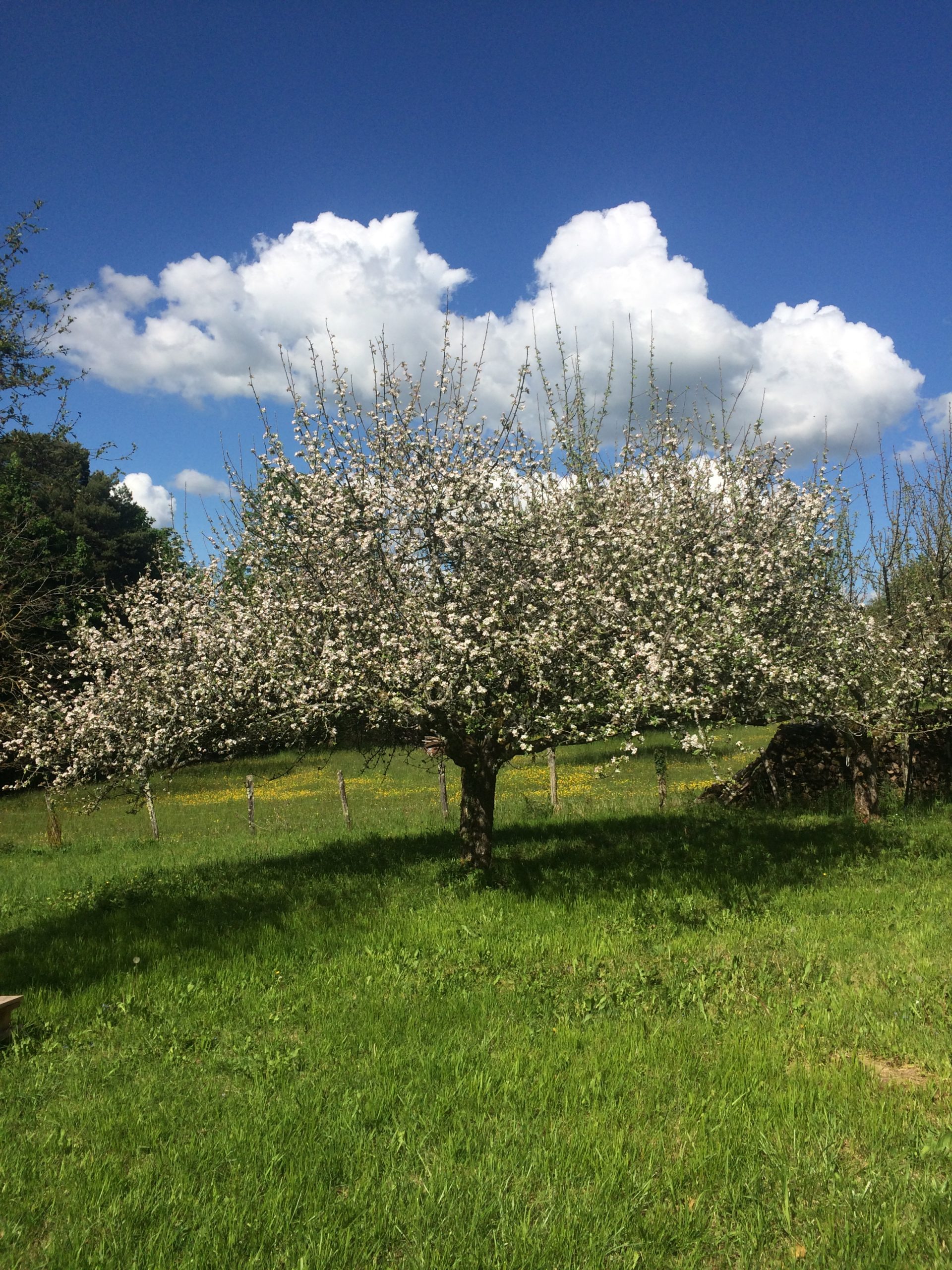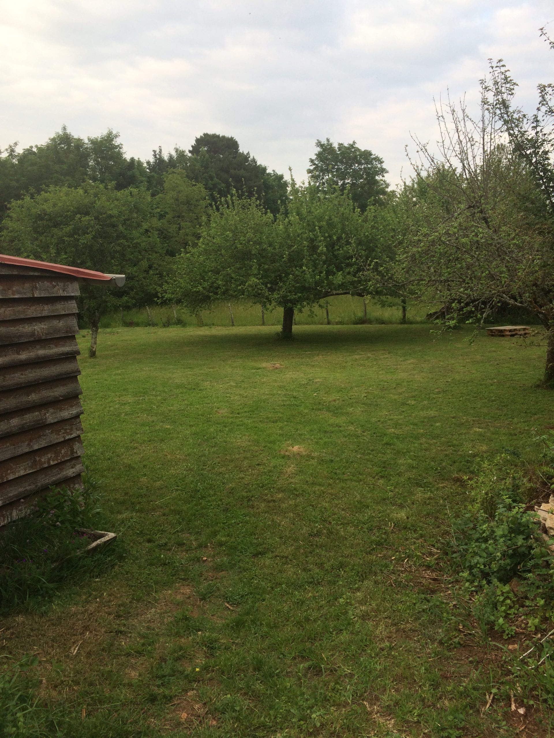 Il y a des pommiers, des cerisiers, mirabelliers, ainsi que des petites fleurs sauvages. Et il se trouve un cabanon en bois, où je stock des outils.