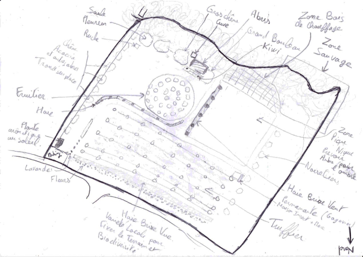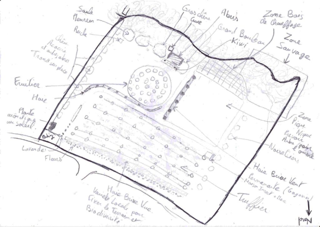 Il est suffisamment grand pour accueillir des jardiniers en manque d’espace. Pour l’instant le puits n’est pas encore creusé mais c’est prévu. Il y aura aussi à terme un petit abris pour stocker du matériel sans valeur car non fermé. En photo vous avez l’idée du design permaculture que nous aimerions faire mais pour l’instant il n’y a rien.